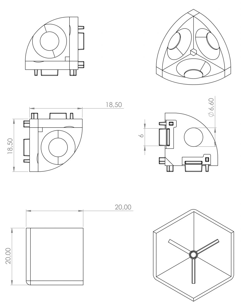 Bezproblemowo połącz trzy profile 20x20 w jednym punkcie dzięki naszemu innowacyjnemu łącznikowi 3D. Montaż nigdy nie był prostszy! Łącznik instalujesz z łatwością przy użyciu trzech śrub ISO 10642-M6X16  dołączonych do zestawu, który zawiera również praktyczną zaślepkę.