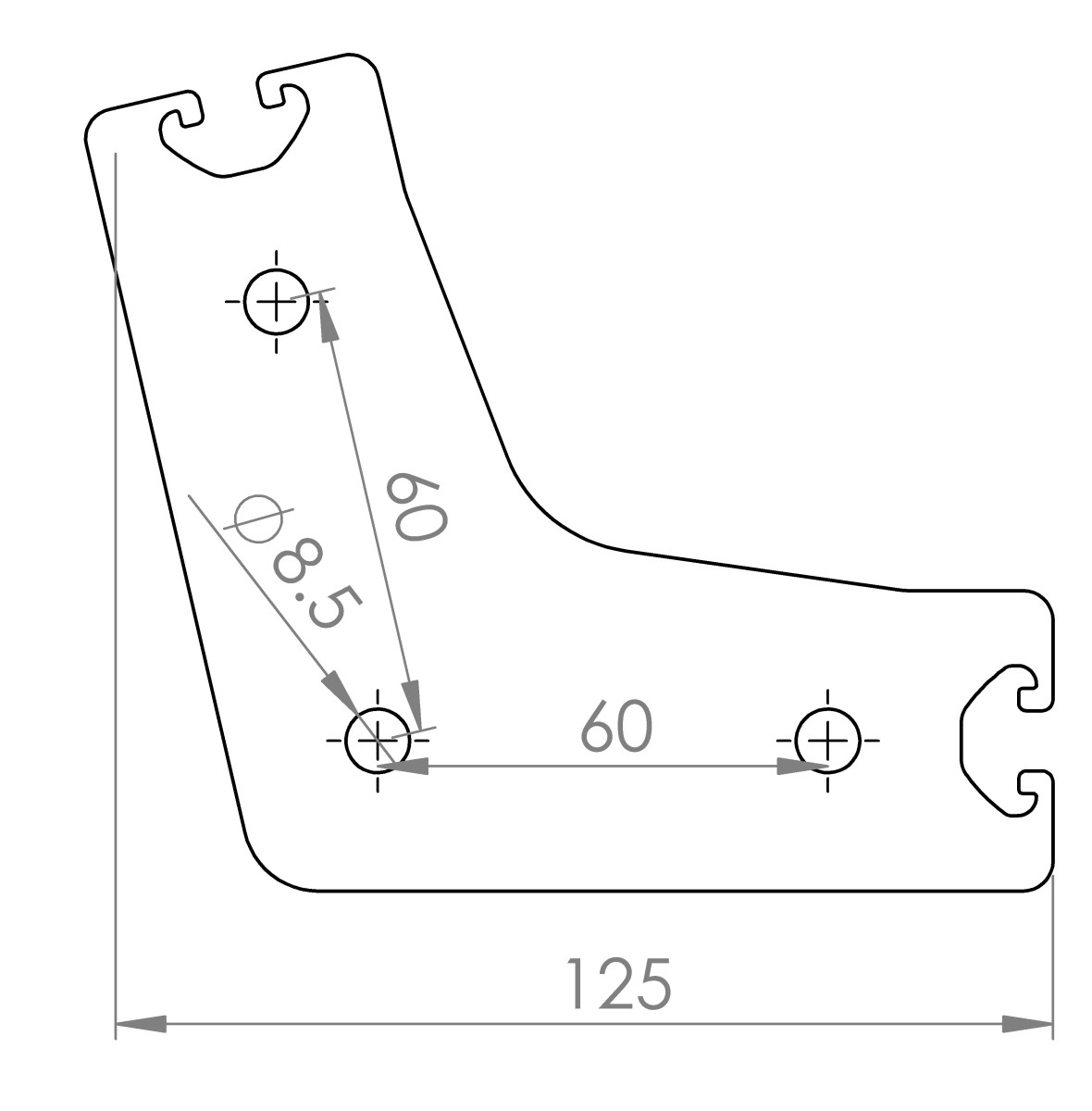 Płyta została wyposażona w otwór o średnicy 8,5 mm, który umożliwia montaż stopek z gwintem M8. Dzięki temu jest w pełni kompatybilna z popularnymi rozwiązaniami stosowanymi w systemach profili aluminiowych.