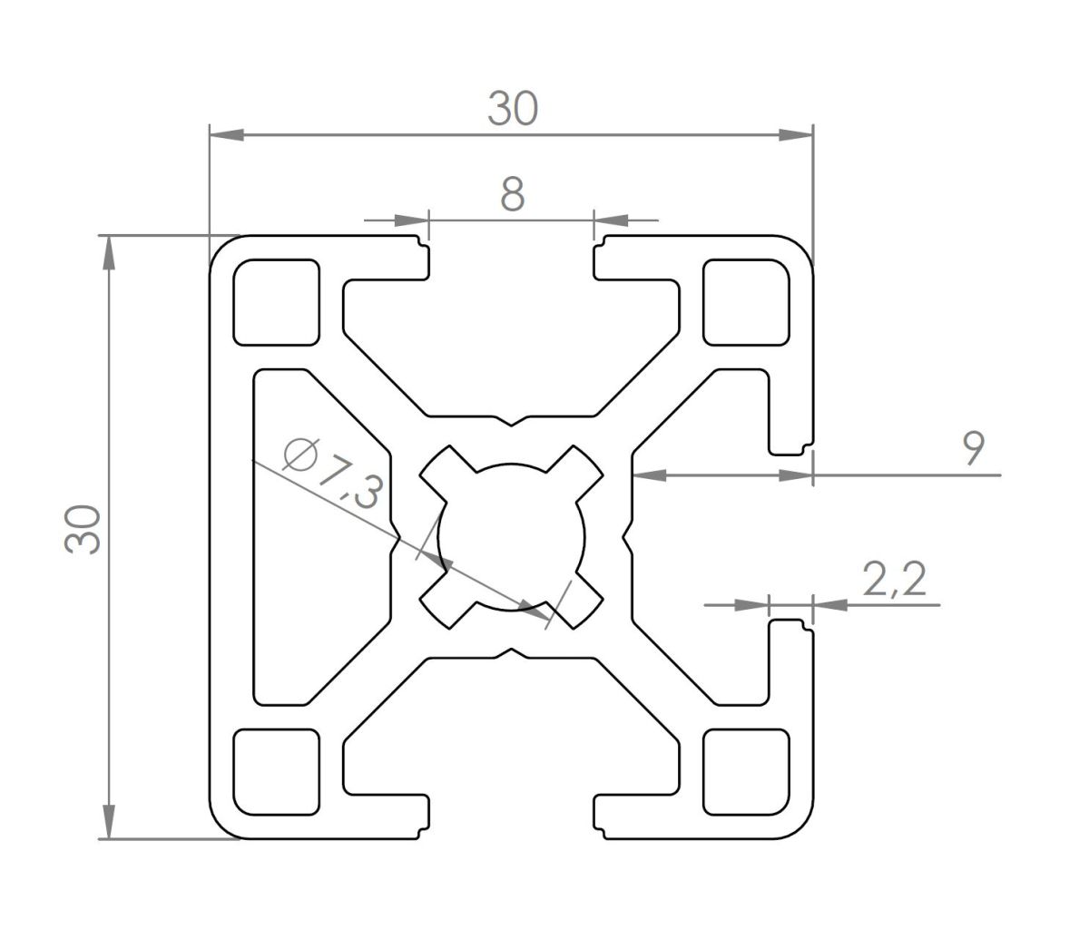 Konstrukcyjny profil aluminiowy Alux 30x30 ma szerokość 30 mm i wysokość 30 mm. Profil systemowy ma 3 szczeliny o szerokości 8 mm. Głębokość rowka T wynosi 9 mm. Na obu końcach profilu znajduje się otwór 7.3 mm, w którym po wcześniejszym użyciu gwintownika możesz umieścić śrubę M8. Profile aluminiowe anodowane.