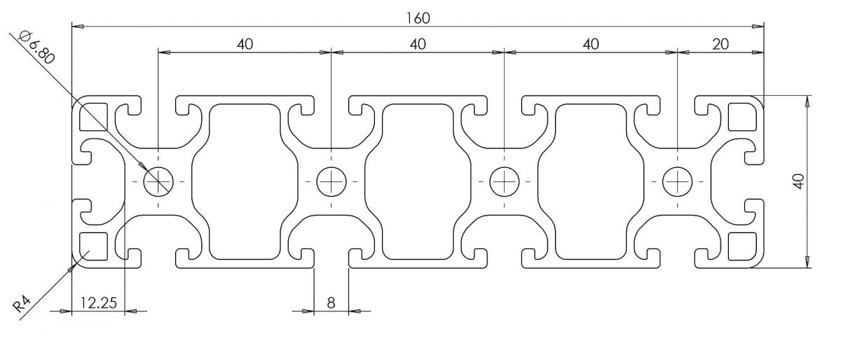 Konstrukcyjny profil aluminiowy czarny Alux 40x160 ma szerokość 160 mm i wysokość 40 mm. Profil systemowy ma 10 szczeliny o szerokości 8 mm. Głębokość rowka T wynosi 12 mm. Na obu końcach profilu znajdują się otwory 6.8 mm, w których po wcześniejszym użyciu gwintownika możesz umieścić śrubę M8. Profile aluminiowe anodowane na czarno.