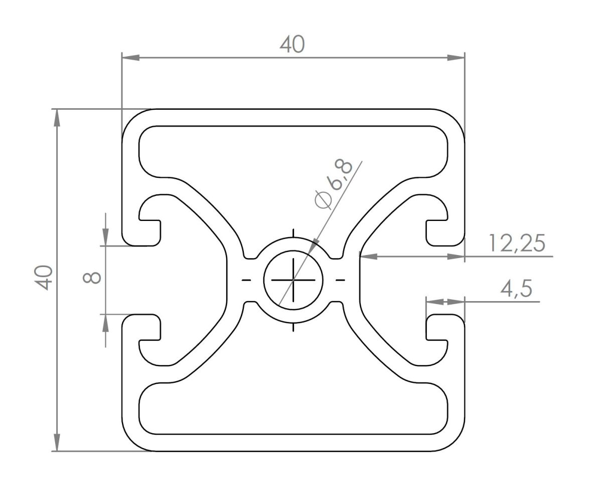 Konstrukcyjny profil aluminiowy Alux 40x40 ma szerokość 40 mm i wysokość 40 mm. Profil systemowy ma 2 szczeliny o szerokości 8 mm. Głębokość rowka T wynosi 12 mm. Na obu końcach profilu znajduje się otwór 6.8 mm, w którym po wcześniejszym użyciu gwintownika możesz umieścić śrubę M8. Profile aluminiowe anodowane.