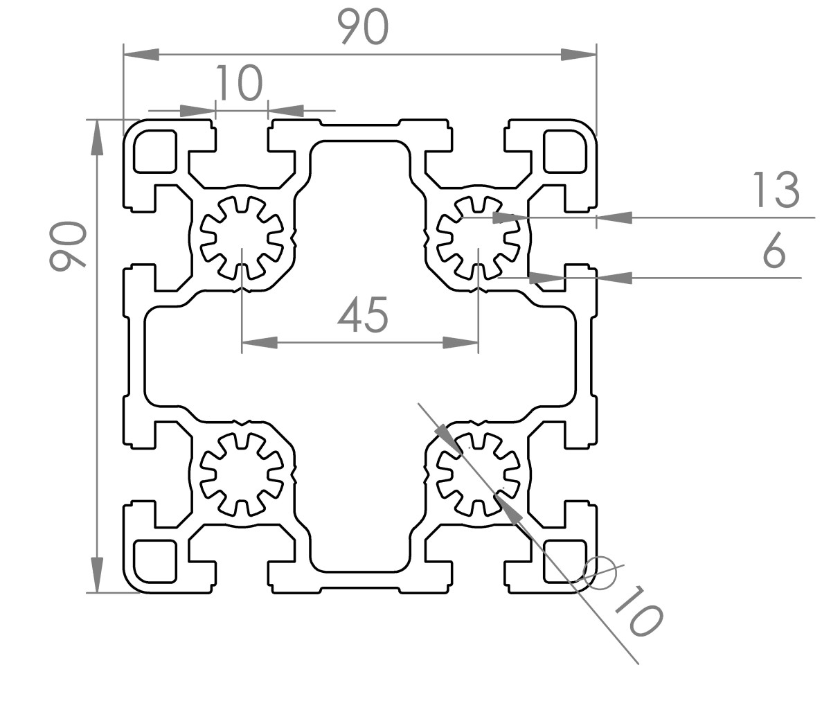 Konstrukcyjny profil aluminiowy Alux 90x90 ma szerokość 90 mm i wysokość 90 mm. Profil systemowy ma 6 szczeliny o szerokości 10 mm. Głębokość rowka T wynosi 14.5 mm. Na obu końcach profilu znajduje się otwór ⌀10 mm, w którym po wcześniejszym użyciu gwintownika możesz umieścić śrubę M12. Profile aluminiowe anodowane.