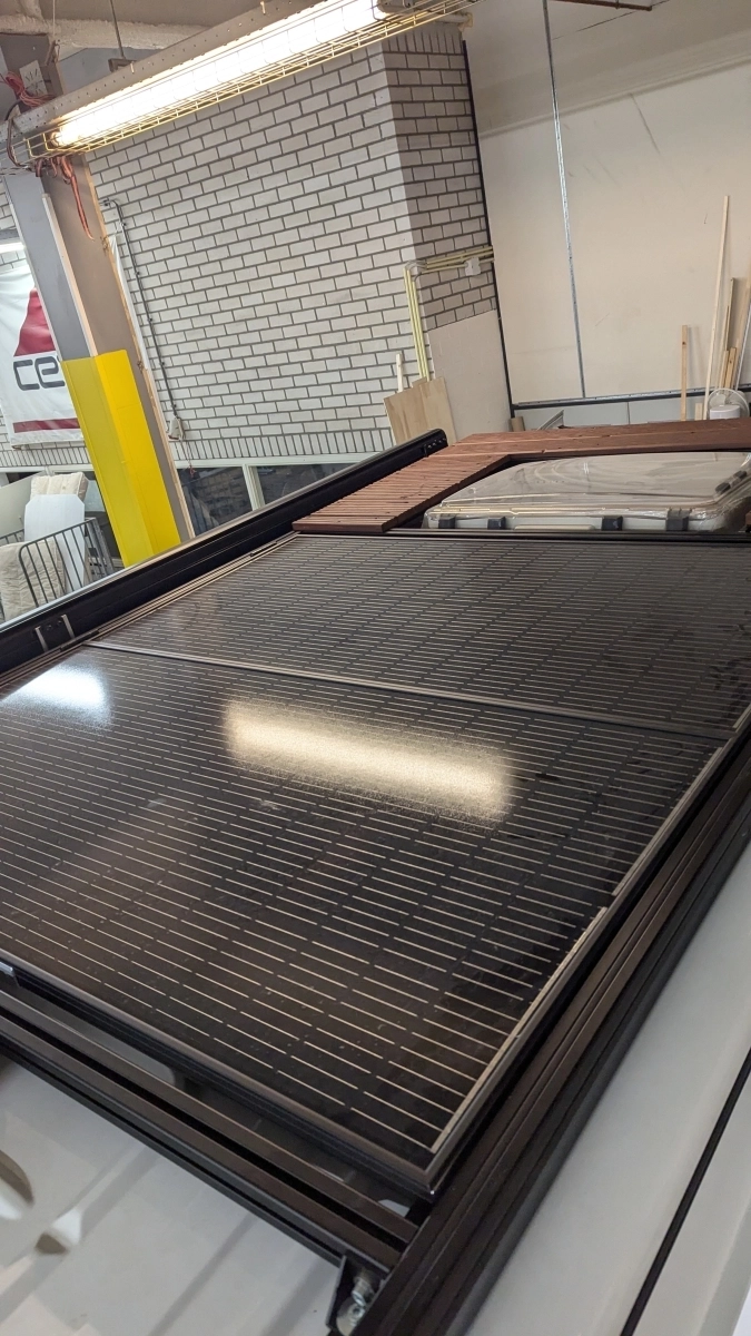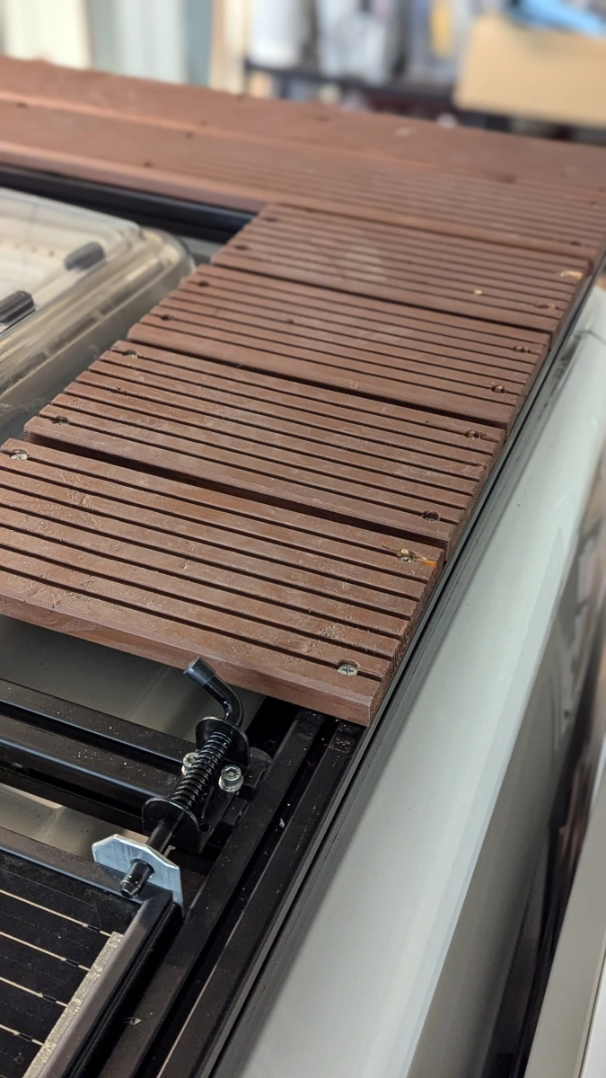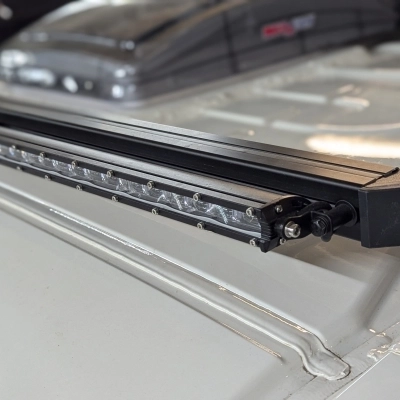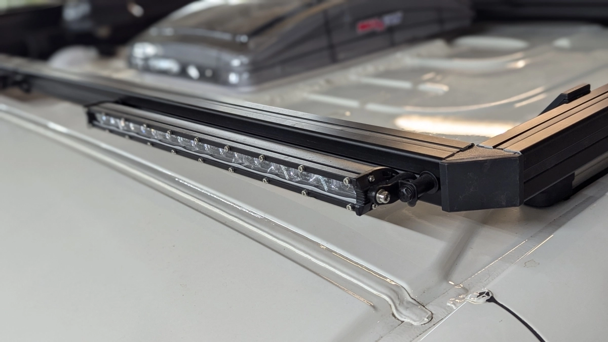 Aby zwiększyć funkcjonalność, zamontowaliśmy oświetlenie przednie i tylne na bagażniku oraz taras na dachu. Dzięki elastycznemu systemowi montażu z nakrętkami T łatwo dodać również płyty piaskowe, antenę Wi-Fi i w przyszłości antenę StarLink w dowolnym miejscu.