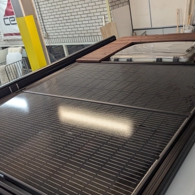 Przymocuj panele słoneczne do poprzeczek za pomocą nakrętek T i śrub imbusowych, aby były stabilne i nie miały luzu. Zdecydowaliśmy się na uchylne panele, aby zwiększyć ich wydajność. Profile aluminiowe pozwalają na niemal dowolne mocowanie, a ich wytrzymałość zapewnia bezpieczeństwo paneli.