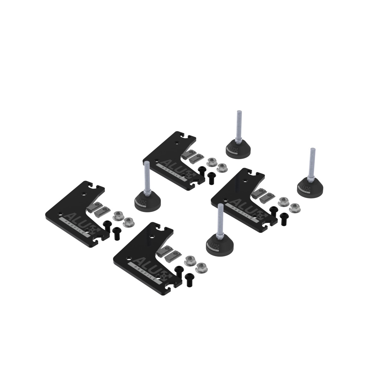 Zestaw został zaprojektowany tak, aby umożliwić szybkie i wygodne zamocowanie regulowanych nóżek do ramy wykonanej z profili aluminiowych.